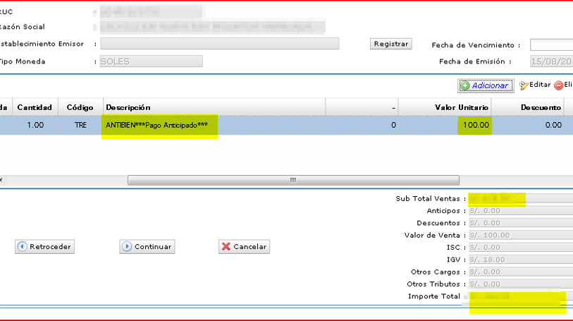 - Item de la factura general sin aplicar anticipos (ejemplo: factura por 1534 soles)